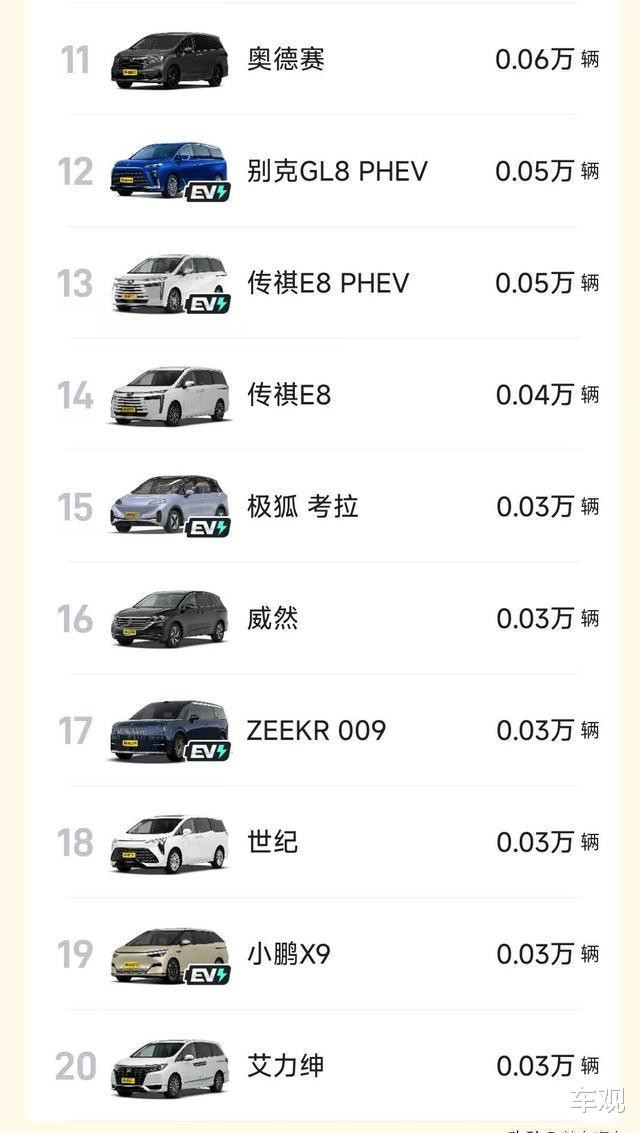 话说在那MPV车型的销售情况里,排名11到20位的这些车型,第三周的销量情况可真是不太乐观呢,全都不足700辆,真的是有点惨兮兮的哦。就拿本田奥德赛来说吧,第三周也就仅仅售出了600多辆而已。还有别克GL8和传祺E8的混动车型呢,它们更可怜,都只有500辆的销量。广汽传祺E8在排名里是第14位,极狐考拉呢则排在第15位,这俩车第三周的销量,都只有三四百辆的样子,实在是不多。再看看大众威然、ZEEKR 009、别克世纪、小鹏X9以及本田艾力绅,它们分别排在16到20名呢,这些车第三周的销量统统都只有300辆,这销售数据看着确实让人觉得有点揪心呐。