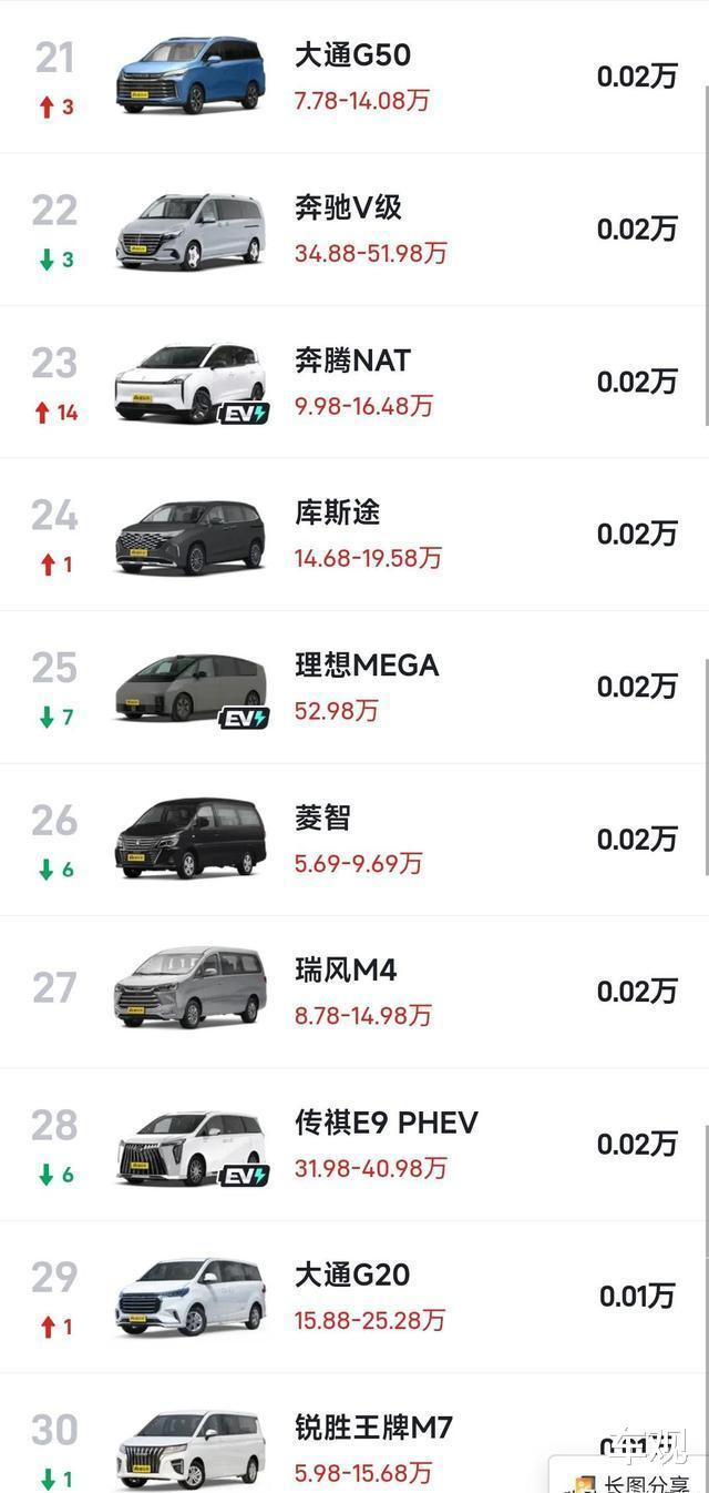 话说在1月份的第三周,那排名在21到30位的MPV车型情况可不太乐观呢。你瞧,大通G50、奔腾NAT、现代库斯途还有大通G20这几款车吧,它们的排名倒是比之前有所回升了,可这销量呢,也就是一两百辆的样子,还是显得挺惨淡的。再看看奔驰V级、理想MEGA、菱智、传祺E9 PHEV以及锐胜王牌M7这几款车,它们也都进到了销量排名的前30位里头。不过呢,它们的排名跟前一周相比,可都是出现了环比下滑的情况哦。就说那理想MEGA吧,它在这第三周的销量仅仅只有200辆,排名是第25位呢。