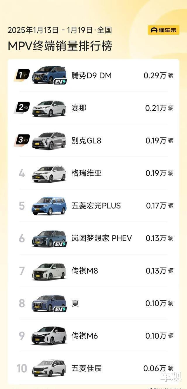 前几天啊,从懂车帝那边得到消息,2025年1月份第三周的MPV销量排行已经出来啦!你猜怎么着,这一周的MPV销量情况那叫一个不太乐观,简直有点惨兮兮的呢。整个榜单看下来,居然没有一款车型的销量能够突破3000辆的。这里面呢,腾势D9可厉害啦,成功实现了卫冕,继续稳坐销量排行的冠军宝座哦。再看丰田赛那和别克GL8,它们俩的排名来了个互换呢。还有格瑞维亚和五菱宏光PLUS这两款车,它们的销量都没达到2000辆。传祺M8呢,在这次排行里只拿到了第7名的位置。不过比亚迪有款新车型叫比亚迪夏,表现还不错哦,排在第8名呢,而且单周的销量超过了1000辆呢。像奥德赛、传祺E8、威然、世纪还有艾力绅这些平日里大家都挺熟悉的主流MPV车型,在1月份第三周的时候,它们的销量就只有几百辆啦,真的是整体都显得有些疲软呢。总之呢,1月第三周的MPV销量排行情况就是这样啦,腾势D9卫冕成功,别克GL8拿到了季军的位置,比亚迪夏的销量也破千啦!
